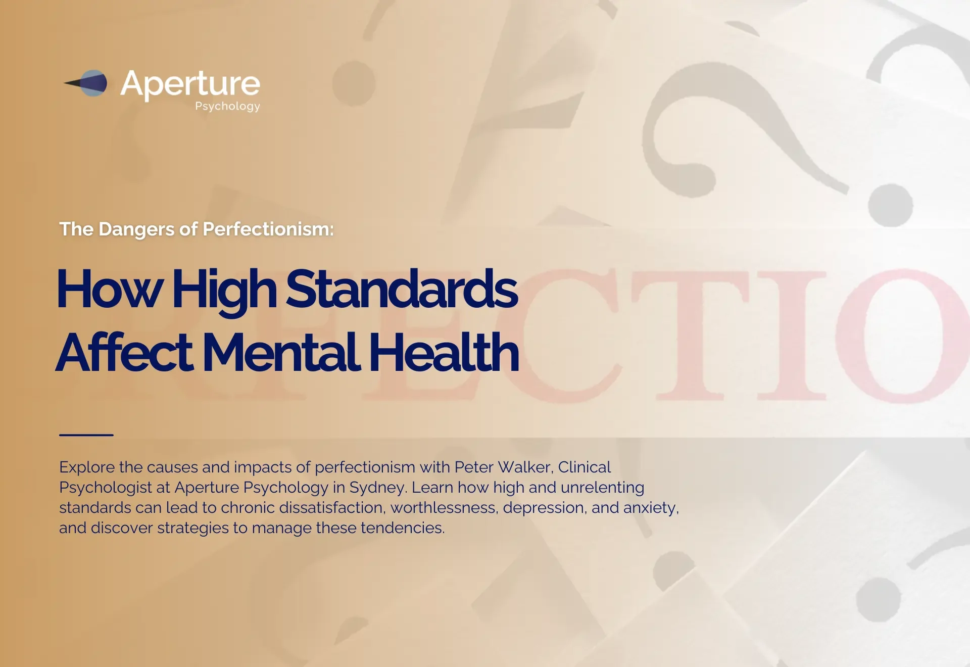 Explore the causes and impacts of perfectionism with Peter Walker, Clinical Psychologist at Aperture Psychology in Sydney. Learn how high and unrelenting standards can lead to chronic dissatisfaction, worthlessness, depression, and anxiety, and discover strategies to manage these tendencies.