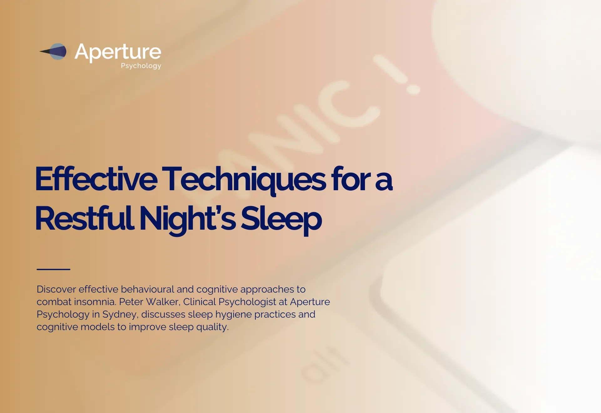 Discover effective behavioural and cognitive approaches to combat insomnia. Peter Walker, Clinical Psychologist at Aperture Psychology in Sydney, discusses sleep hygiene practices and cognitive models to improve sleep quality. Our experienced clinical psychologists offer personalised treatment plans in Sydney and telehealth services Australia-wide.