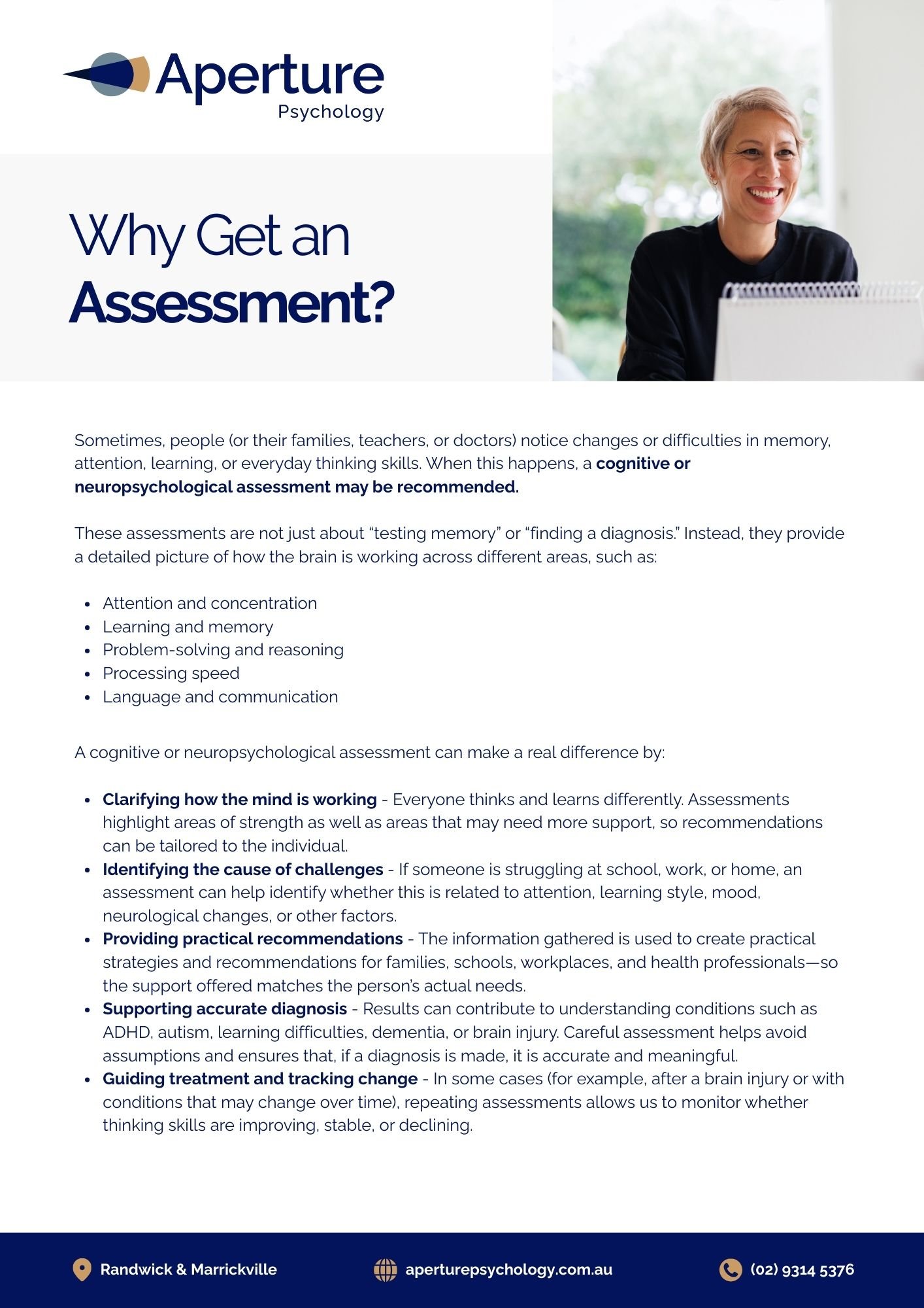 Sometimes, people (or their families, teachers, or doctors) notice changes or difficulties in memory, attention, learning, or everyday thinking skills. When this happens, a cognitive or neuropsychological assessment may be recommended.
